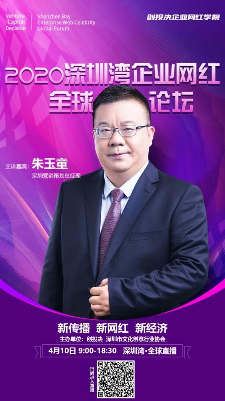 2020年4月10日,“新传播、新网红、新经济,2020深圳湾企业网红全球论坛”,由创投决 深圳市文化创意产业协会主办;国际e健康产业联盟、中翰鼎盛集团、广东省战略知识产权研究院联合主办,深圳市采纳品牌公司作为本次大会的协办单位,采纳公司总经理朱玉童先生作《品牌,让老虎飞起来!》的主题线上直播分享。