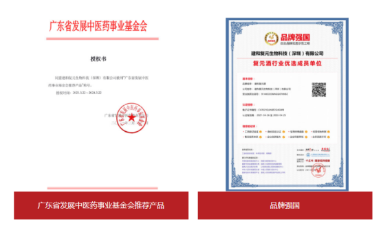 建和复元酒露酒一经上市就荣获了“广东省发展中医药事业基金会推荐产品”,并且经由品牌强国示范工程深圳地区运营中心审核、认证、社会公示,“建和复元酒露酒”符合示范工程评选标准,成功入选为品牌强国示范工程复元酒行业优选成员单位,企业信息录入品牌强国示范工程数据库,在国家级平台展示品牌形象。