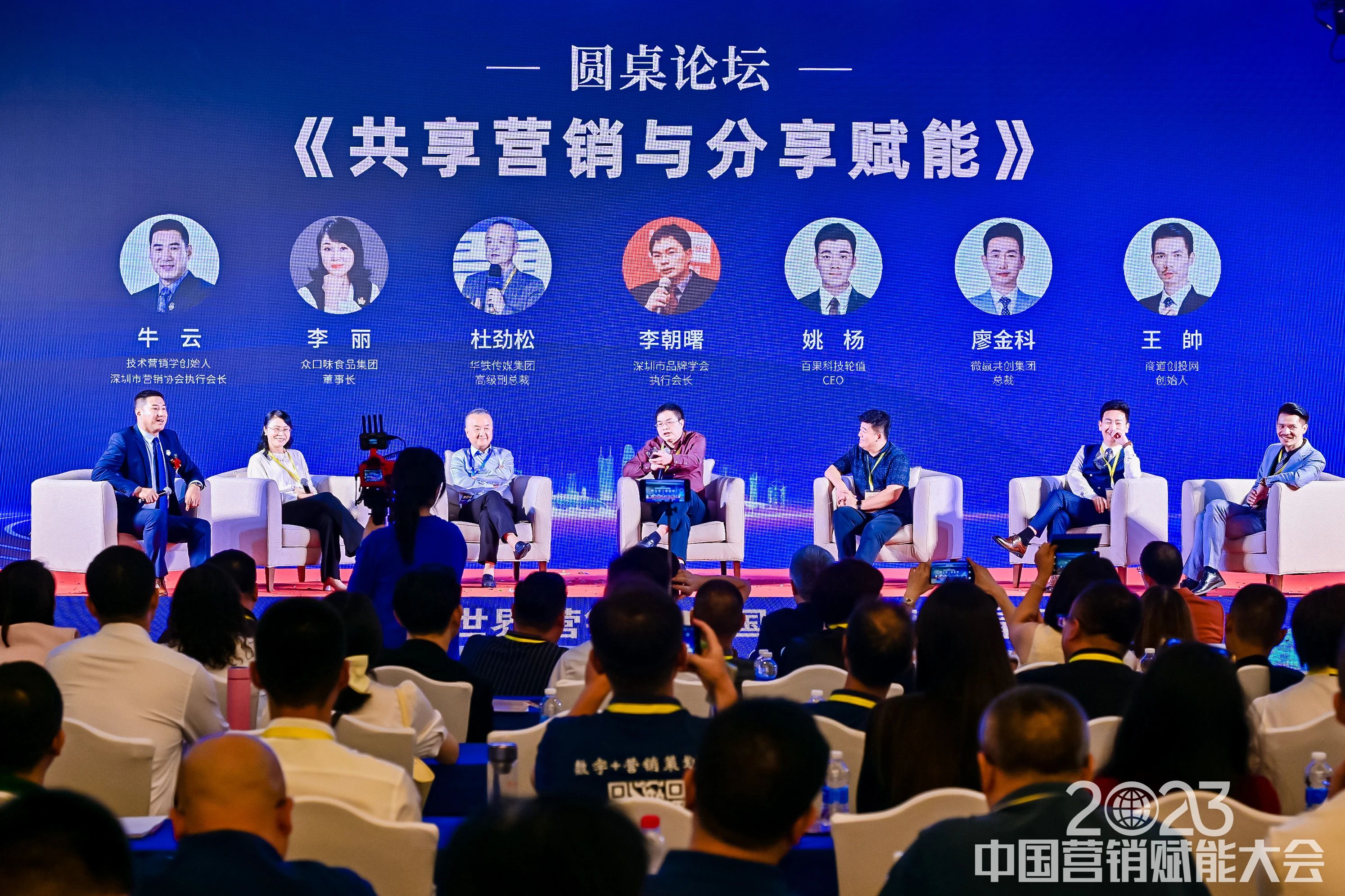 圆桌论坛由技术营销学创始人、深圳市营销协会执行会长牛云老师(左一)主持,参与圆桌论坛的嘉宾从左到右依次为,众口味食品集团董事长李丽、华铁传媒集团副总裁杜劲松、深圳市品牌学会执行会长李朝曙、百果科技轮值CEO姚杨、微赢共创集团总裁廖金科、商道创投网创始人王帥。