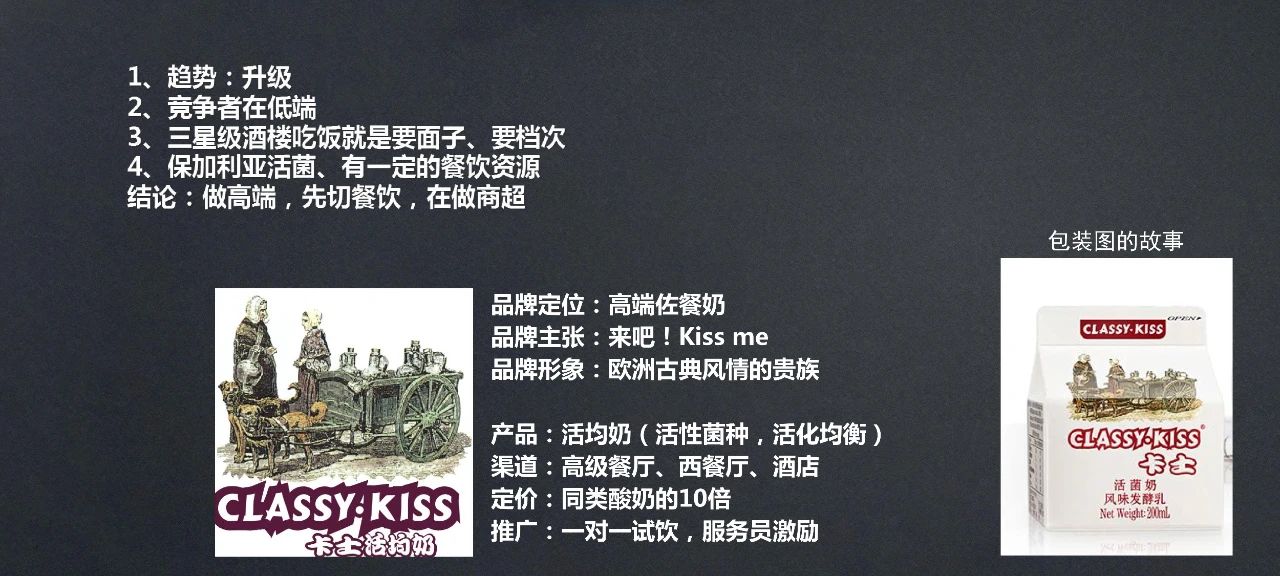 好的品牌抢位,可以享受24年的财富荣耀——2000年左右当时,?采纳观察到消费升级的趋势,?并发现高端牛奶市场存在巨大空间,?而竞争者主要聚焦在低端市场。?采纳让卡士牛奶抢位高端佐餐牛奶,?通过独特的品牌形象、?包装故事以及高定价策略,?成功吸引了三星级酒店等高端市场。?经过24年的发展,?该品牌已成为中国高端奶的第一品牌,?每年为老板带来数亿利润,?累计利润已破百亿。