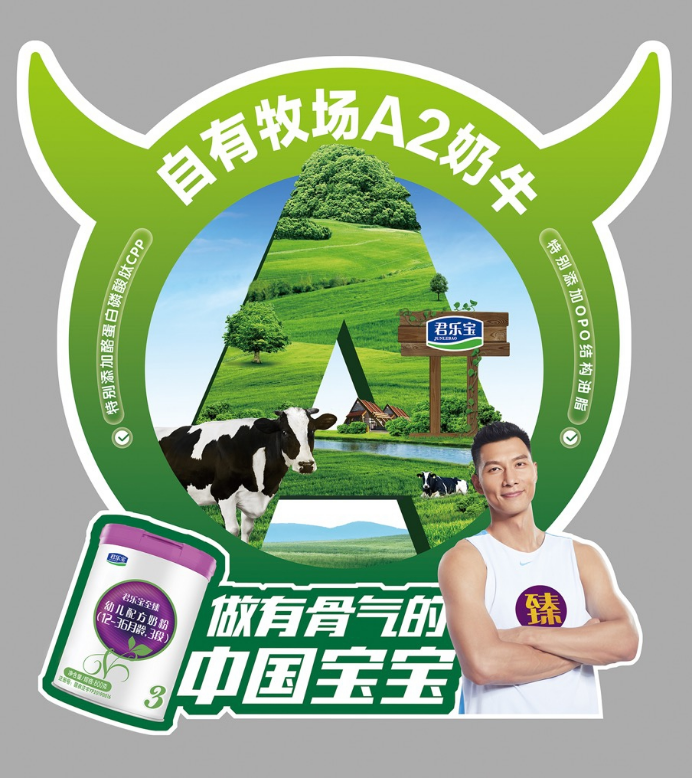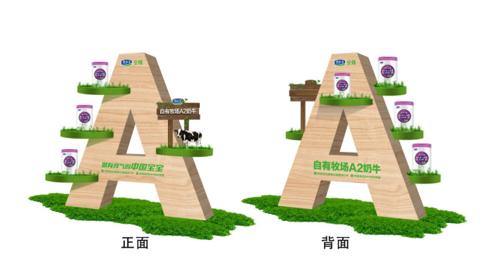 零售终端是品牌体验和消费拦截的最佳场所,而视觉锤是实现拦截的重磅武器,用代表A2奶源的“A”结合立体天然牧场,打造“A2奶牛牧场”的独特视觉锤,把“自有牧场A2奶?!钡钠放萍壑道卫沃踩胂颜叩男闹牵⒔泳醮腹岽┱鲋斩松杓?,从海报到产品展示,不断强化君乐宝至臻就是“A2奶牛奶粉”的视觉记忆。